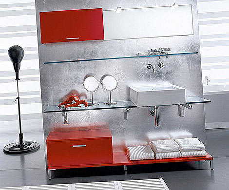 dolapları kırmızı rafları cam olan şık banyo modeli,göz kamaştırıcı banyo modelleri