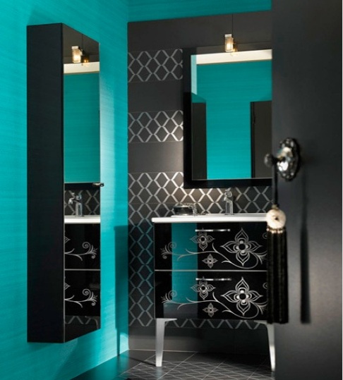 duvarları mavi dolapları siyah cam ve üzeri desenli olan dekoratif ve ilginç lavabo modeli,modern banyo modelleri