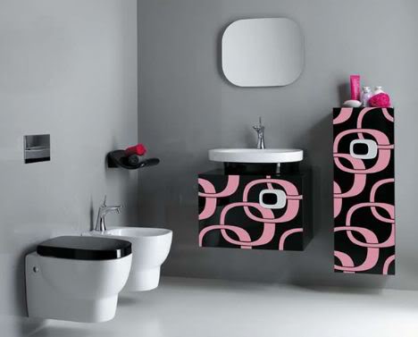 dolabı siyah üzerinde pembe ile deseni olan klozeti ve lavabos beyaz cam olan ilginç şık banyo modelleri,sade banyo modelleri duvarlar siyah küvet ve lavabo beyaz cam olan üzerlerinden siyahla geometrik şekiller çizen şık banyo modeli,takım tutanlar için ideal banyo modeli dolapları turuncu olan duvarlar siyah beyaz küçük camlarla kaplanmış lavabosu ise beyaz cam olan yeni trend banyo modeli,büyük banyo modelleri