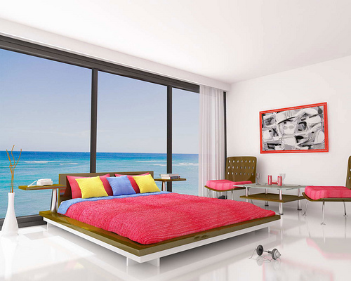 boydan boya büyük cam olan pencerede ise deniz steckeri olan farklı yatak odası modeli,pembe yataklı ilginç aksesuarlı pencere steckerli yatak odası modeli